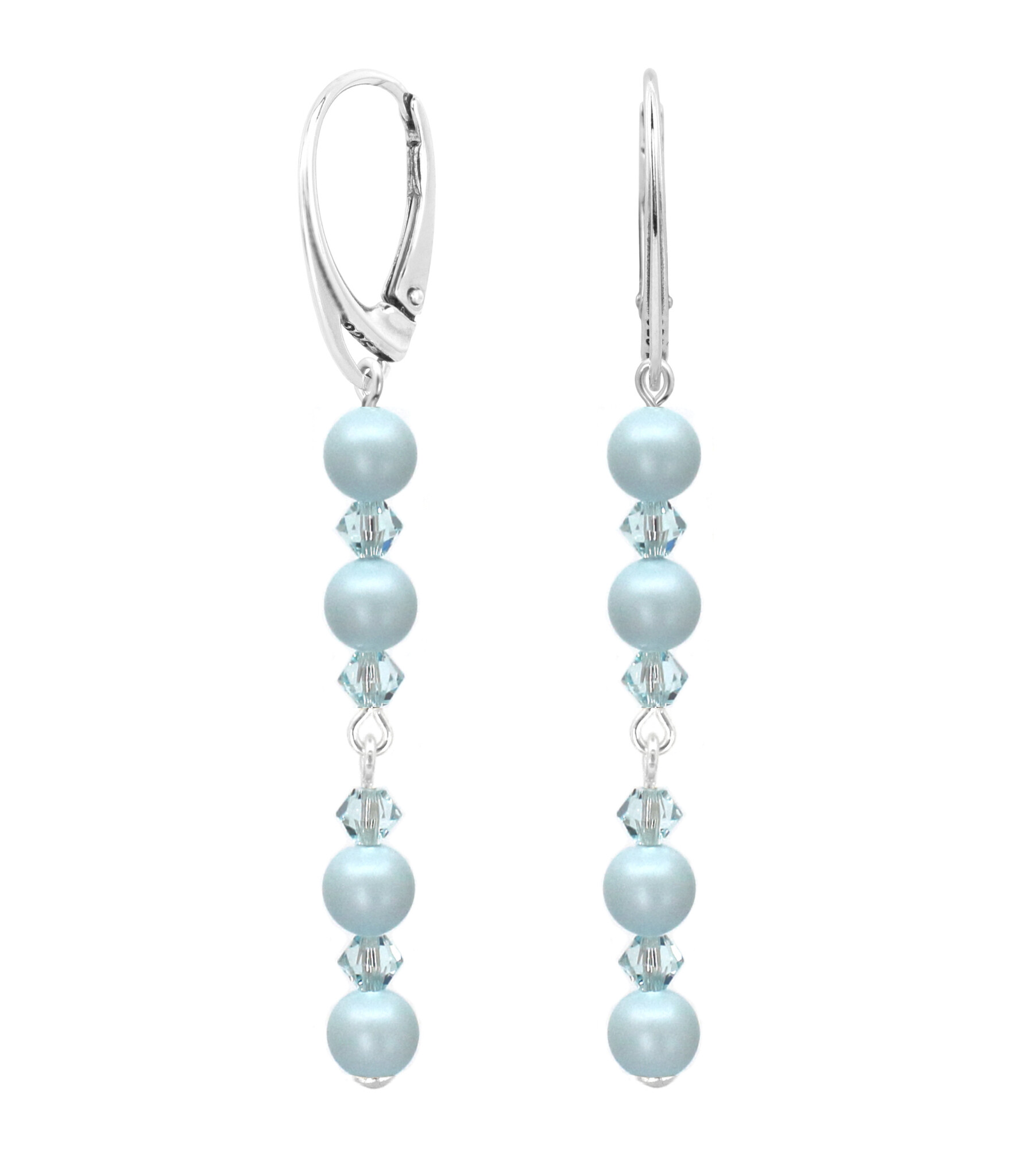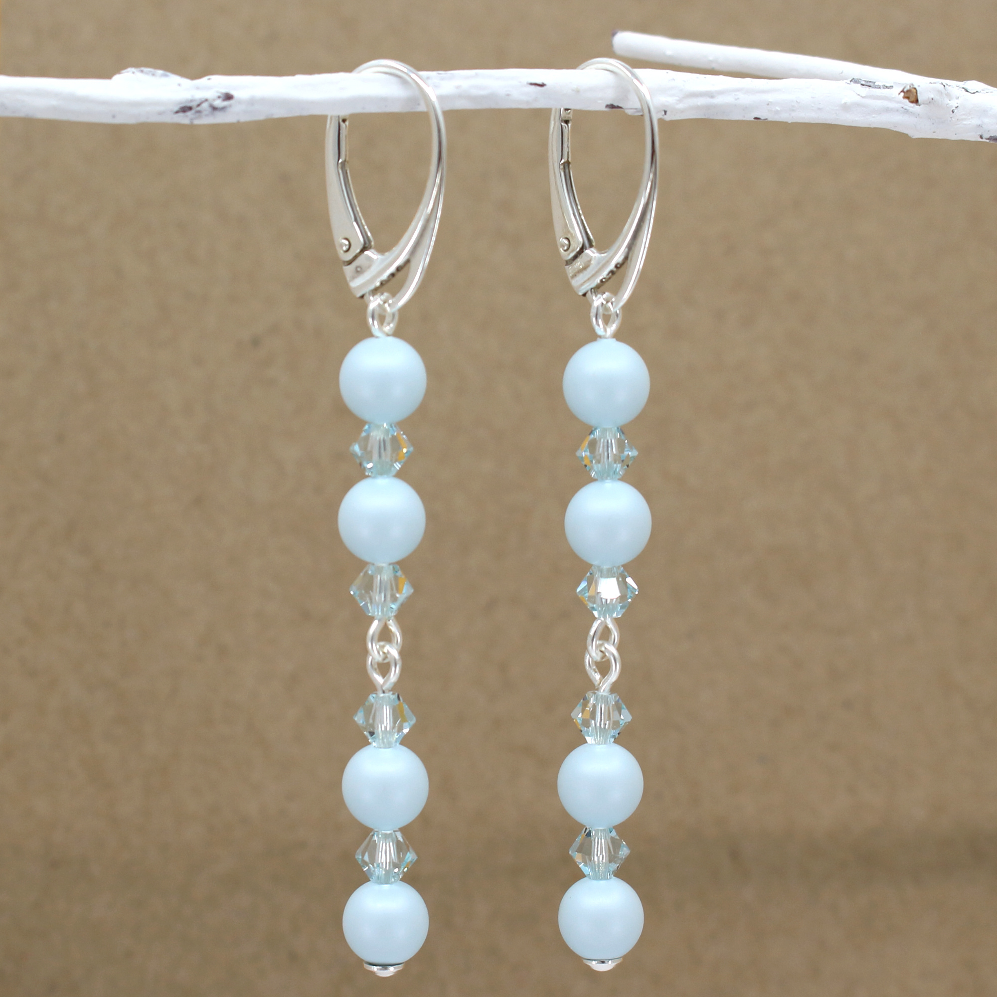 Einzigartige, handgefertigte Ohrringe aus Sterlingsilber hergestellt mit pastellblauen matten Swarovski-Kristallperlen und funkelnden blauen Swarovski-Kristallen. Mit diesen exklusiven funkelnden Ohrringen haben Sie einen fantastischen und eleganten Eye-catcher. Kristallperlen von Swarovski werden mit einem Kristallkern hergestellt. Swarovski Kristall hat eine diamantähnliche Wirkung, eine hochwertige Verarbeitung, eine funkelnde Optik und ist eine hervorragende und erschwingliche Alternative zu Diamanten.