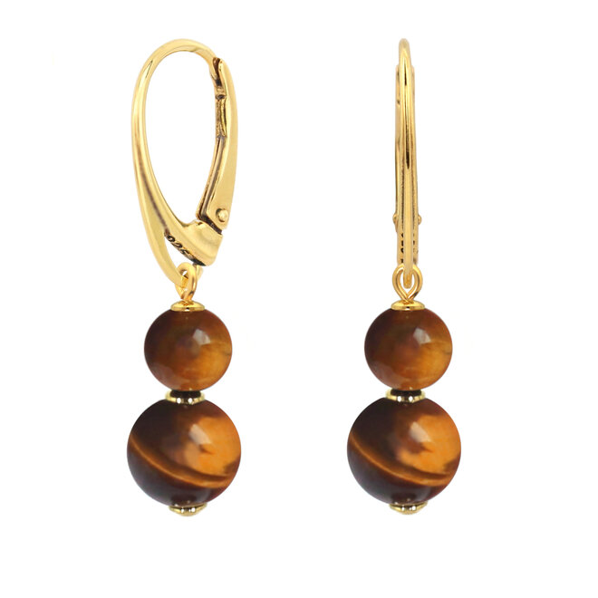 Handgefertigte, einzigartige Ohrringe vergoldet mit Silberkern mit einem Anhänger aus wunderschön glänzenden Tigeraugeperlen in verschiedenen Größen. Tigerauge ist ein Edelstein mit einem wunderschönen Farbeffekt, der es einfach macht, den Schmuck mit Modefarben und -stilen zu kombinieren.