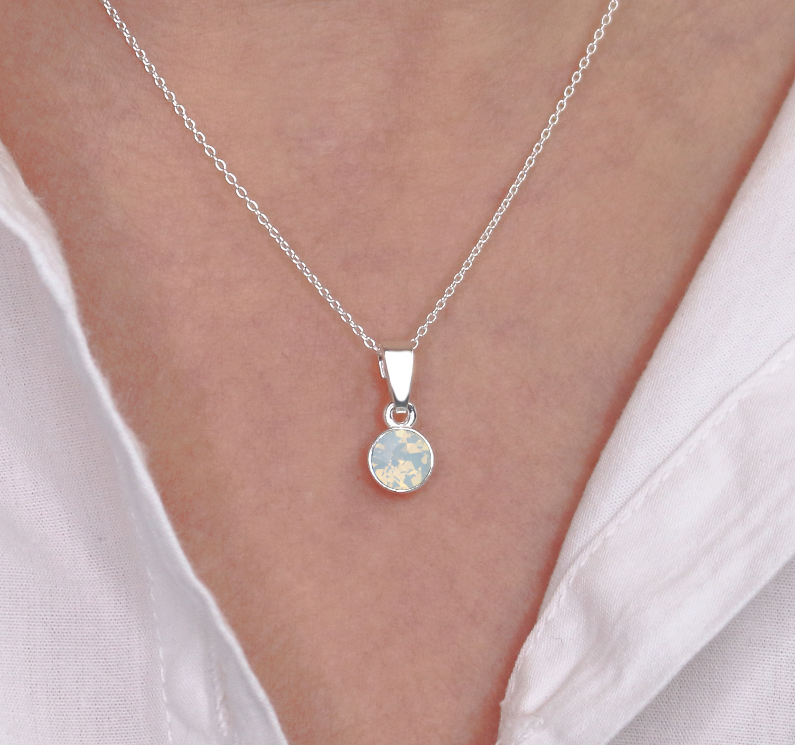 Dieses elegante, klassische Schmuckset, bestehend aus einer Halskette und Ohrringen aus Sterlingsilber mit einem kleinen weißen Opal-Swarovski-Kristall, ist zeitlos und ein perfektes Geschenk für sich selbst oder jemand anderen. Swarovski Kristall hat eine diamantähnliche Wirkung, eine hochwertige Verarbeitung, eine funkelnde Optik und ist eine hervorragende und erschwingliche Alternative zu Diamanten.