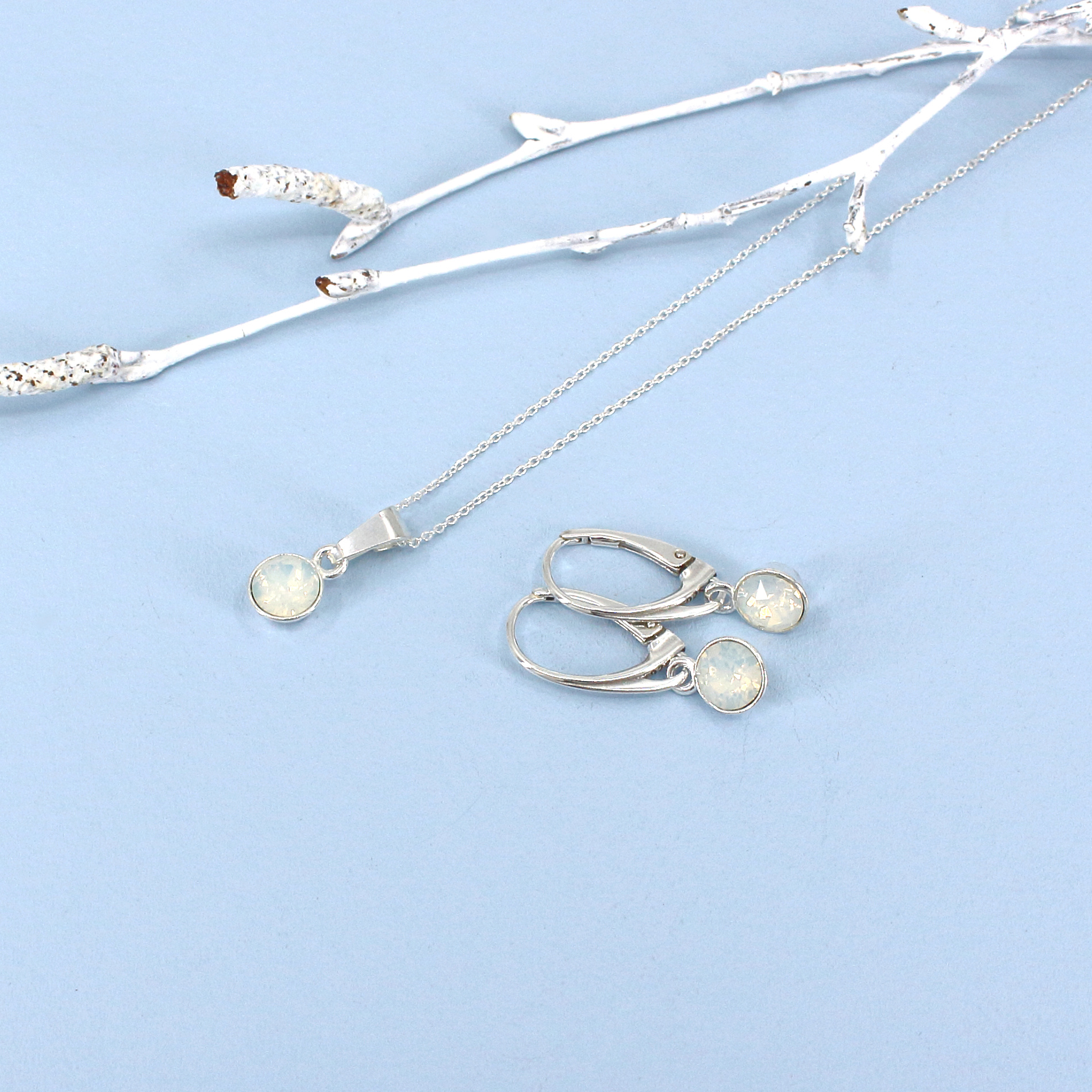 Schmuckset aus Sterlingsilber mit Halskette und Ohrringen, verziert mit einem weißen Opal-Swarovski-Kristallanhänger. Kettenlänge: 40-44 cm. Ohrringe: 2,5 cm. Kristall: 6 mm.