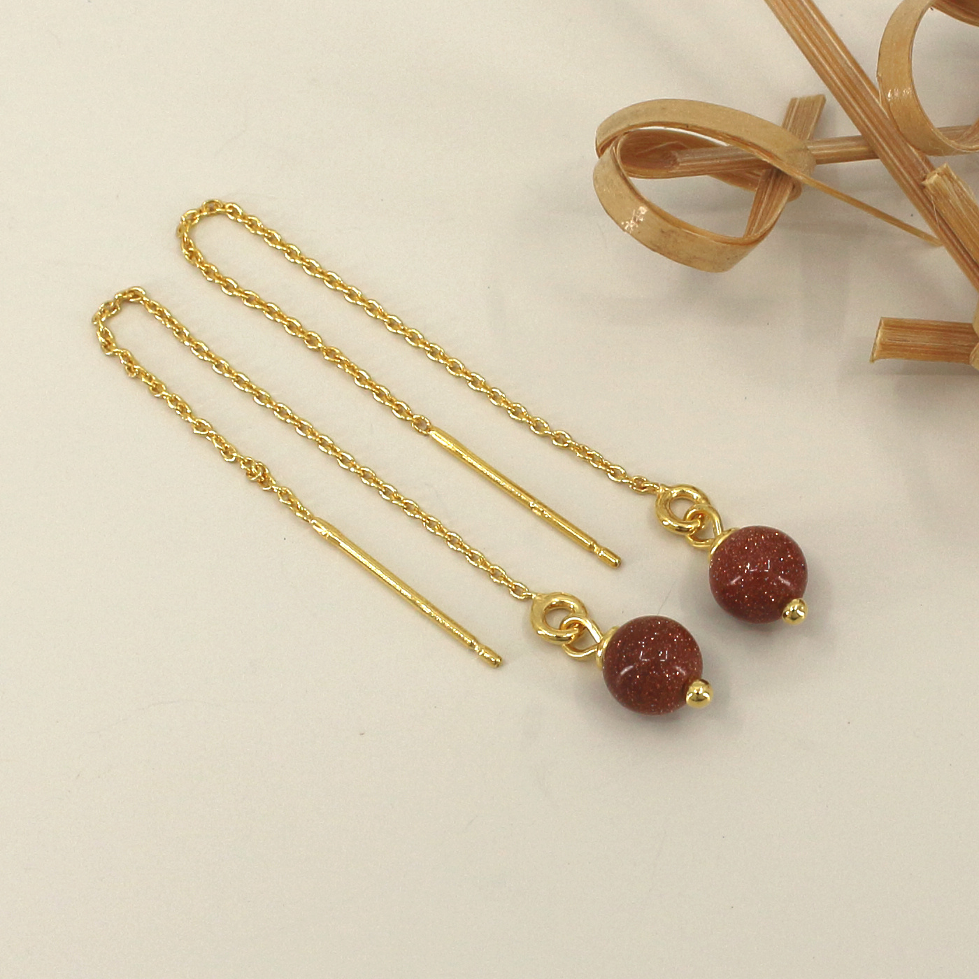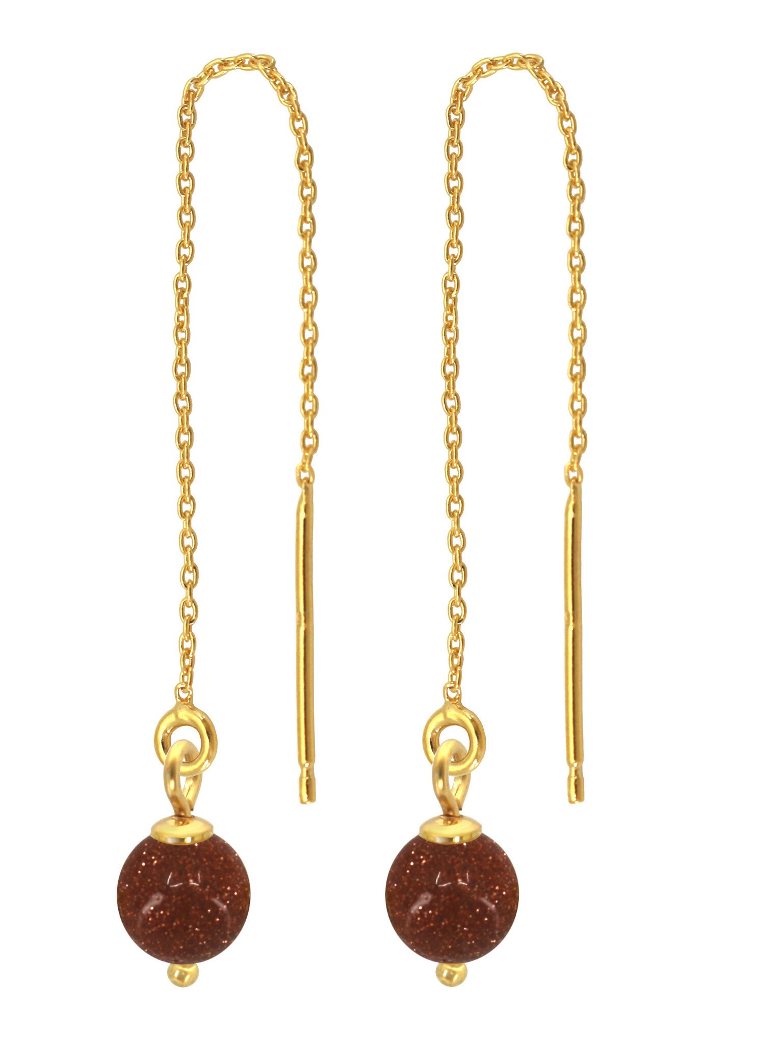 Trendy sierlijke doortrekoorbellen met een fijn schakeltje, verguld met zilveren kern, hebben een hangertje van sprankelend oranje-bruin goudsteen dat fonkelt door de gouden spikkels. Deze mooie edelsteen is een stijlvolle aanvulling op je sieradencollectie.