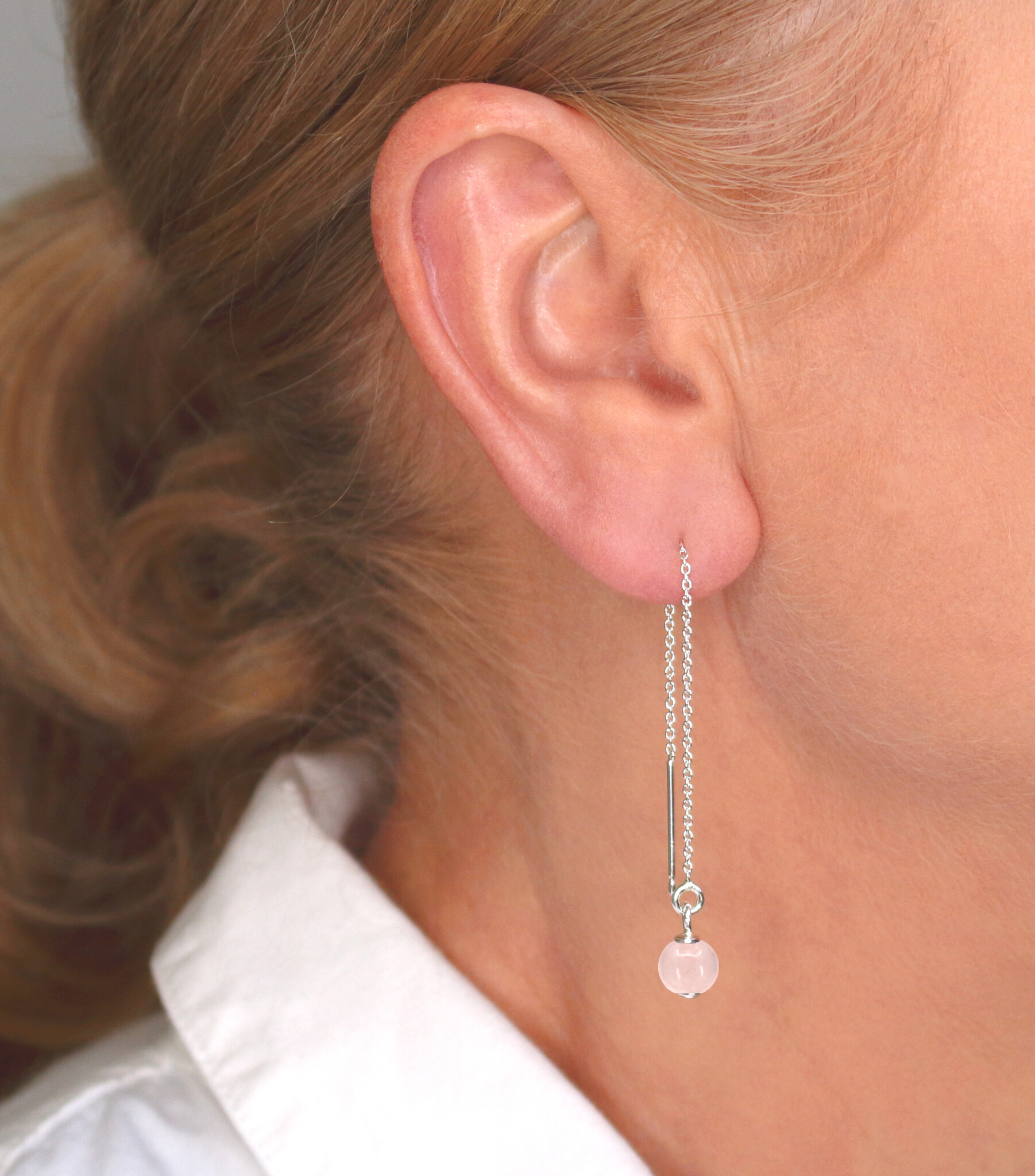 Trendy sierlijke sterling zilveren doortrekoorbellen met een fijn schakeltje hebben een hangertje met een edelsteentje; een glanzend geslepen zachtroze rozenkwarts.