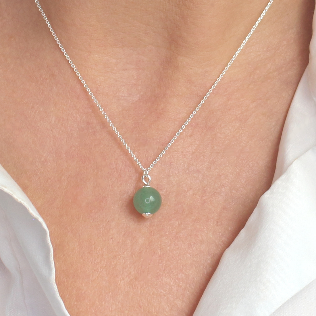 Handgemaakte unieke sterling zilveren ketting met een prachtige glanzende groene aventurijn kraal hanger. Aventurijn behoort tot de kwartsfamilie, na slijping en polijsten heeft de steen een mooie gladde structuur en een prachtige glans en schittering. Groene aventurijn wordt ook wel de steen van mogelijkheden genoemd; de steen zou geluk en energie brengen en kansen geven vooral als het gaat om welvaart en je financiële situatie. Aventurijn mag met water gereinigd worden, zorg ervoor dat het zilver niet nat wordt.