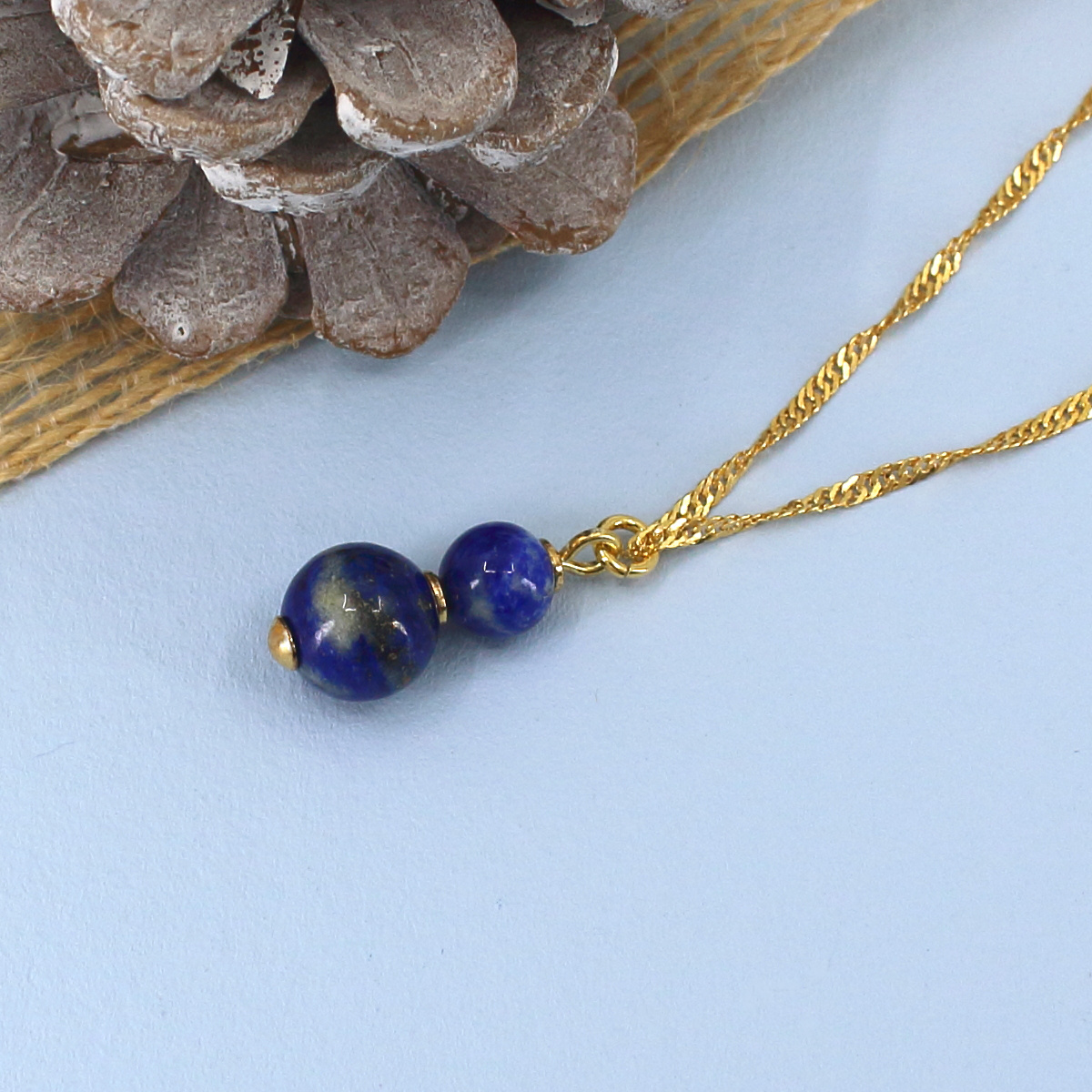 Singapore ketting, verguld met zilveren kern, met een hanger gemaakt met twee lapis lazuli kralen in verschillende maten. Een Singapore ketting bestaat uit een reeks platte ruitvormige schakels die gedraaid en plat gemaakt worden; dit zorgt voor een schitterend effect omdat het licht steeds vanuit een andere hoek weerspiegeld wordt.