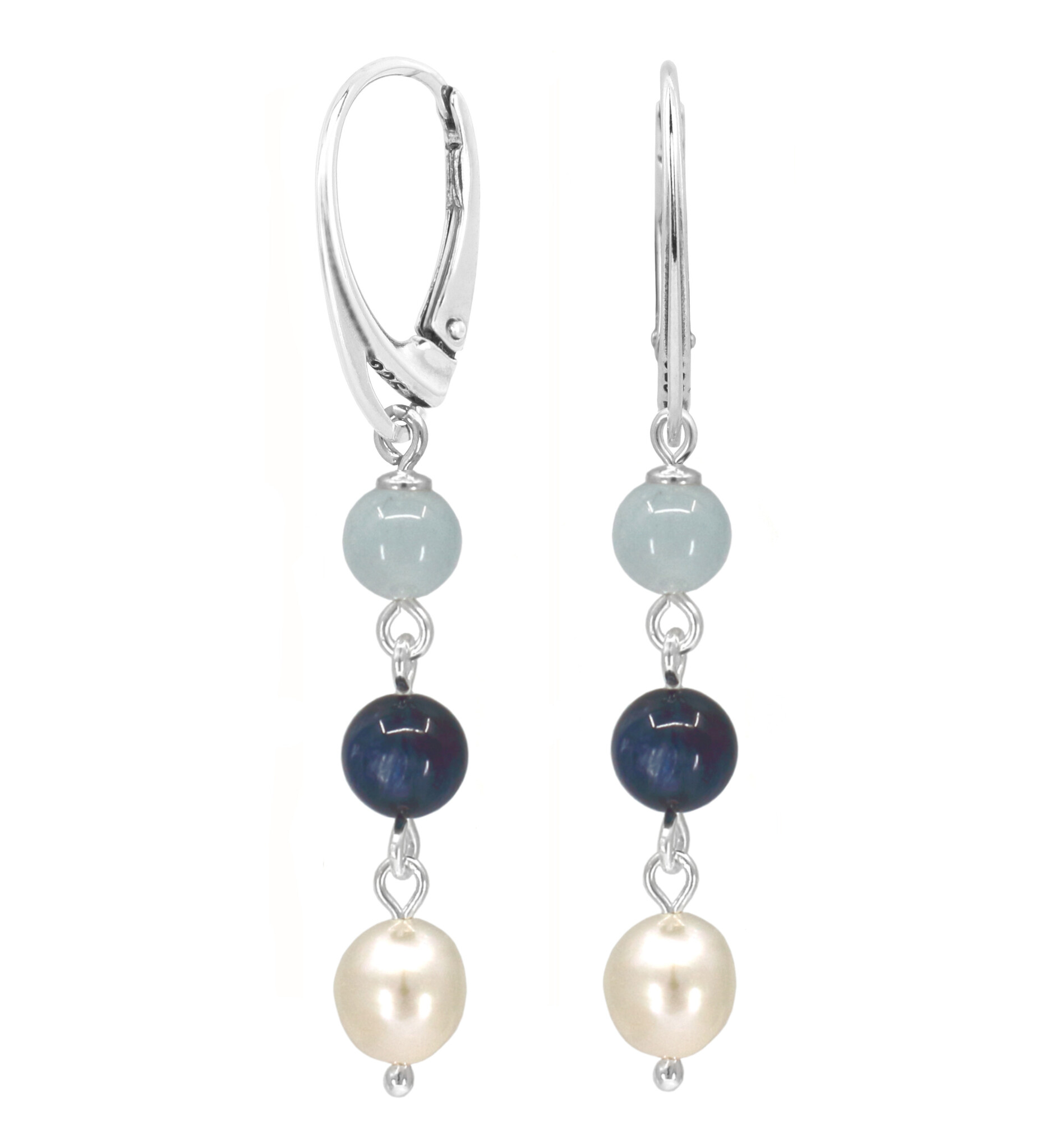 Handgemaakte sterling zilveren oorbellen met een moderne look met prachtige lichtblauwe aquamarijn, blauw-grijze kyaniet en witte zoetwaterparel kralen. De edelsteentjes hebben een mooie glans en passen bij de nieuwste trendkleuren.
