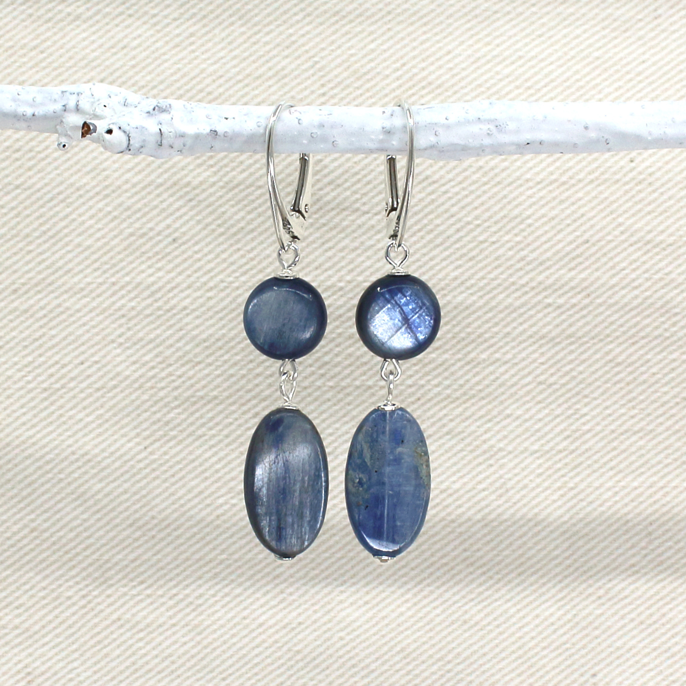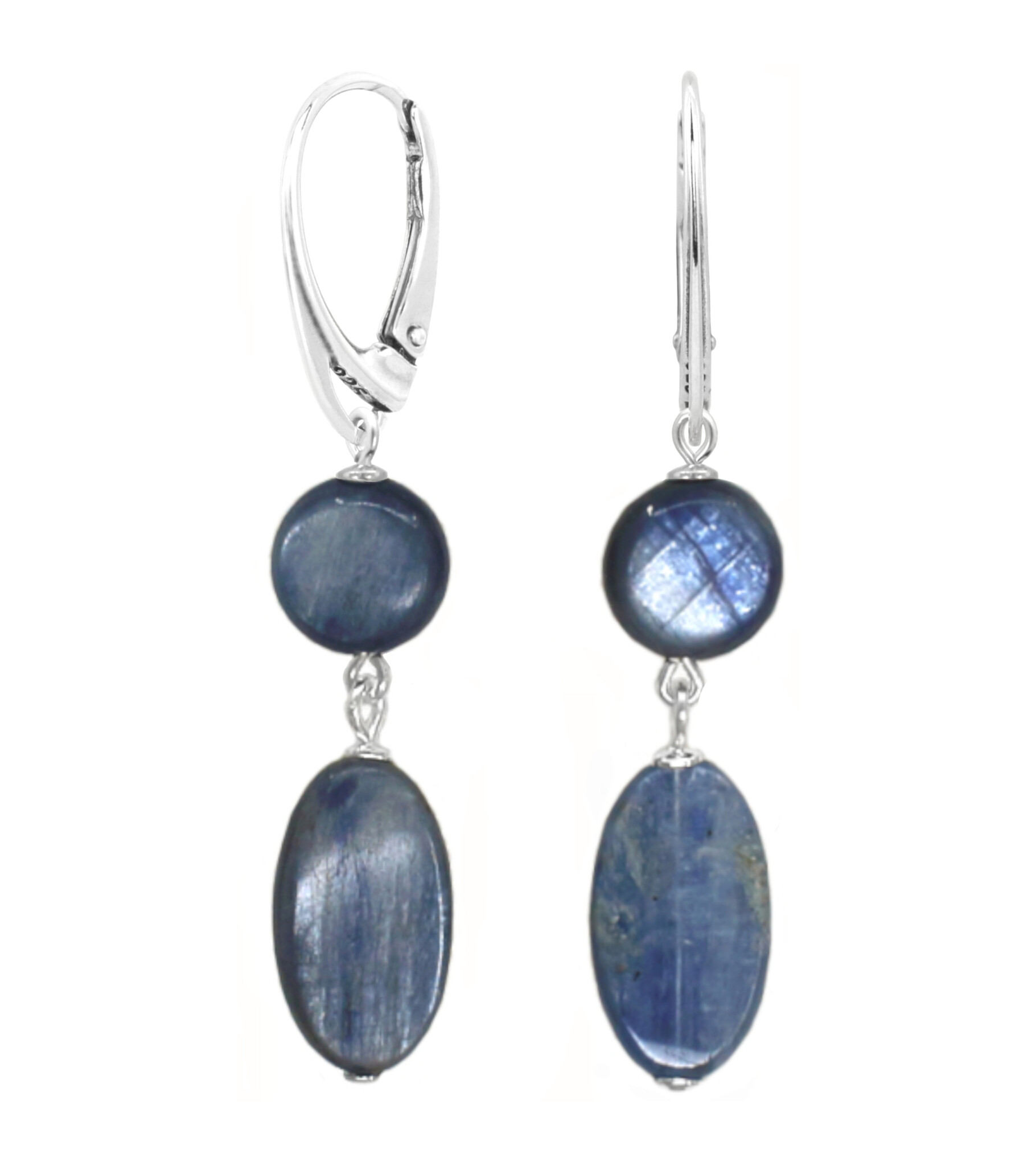 Handgemaakte sterling zilveren oorbellen met een moderne look met prachtig blauw-grijze kyaniet edelsteenkralen. De denim blauwe kleur schittert en past bij de nieuwste trendkleuren.