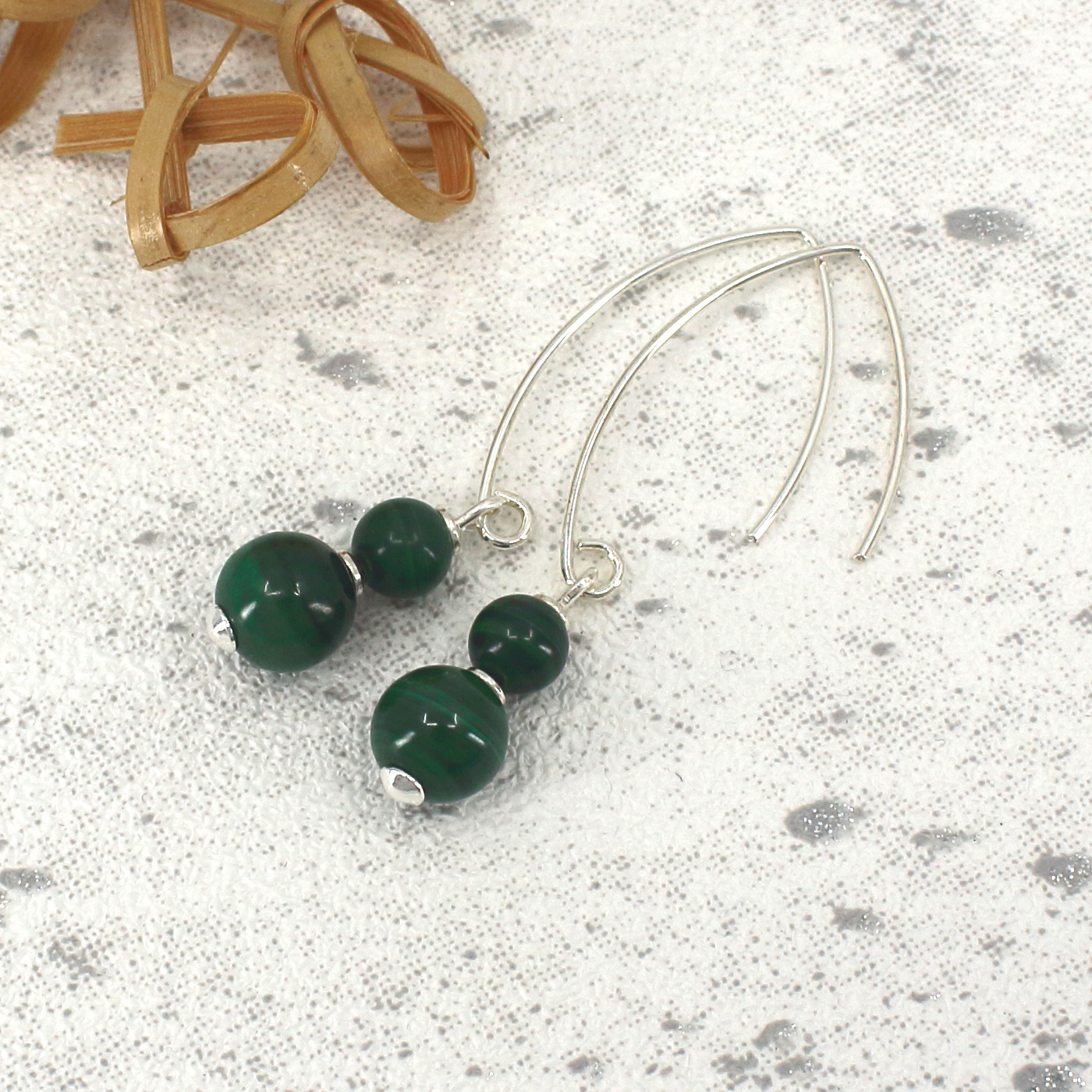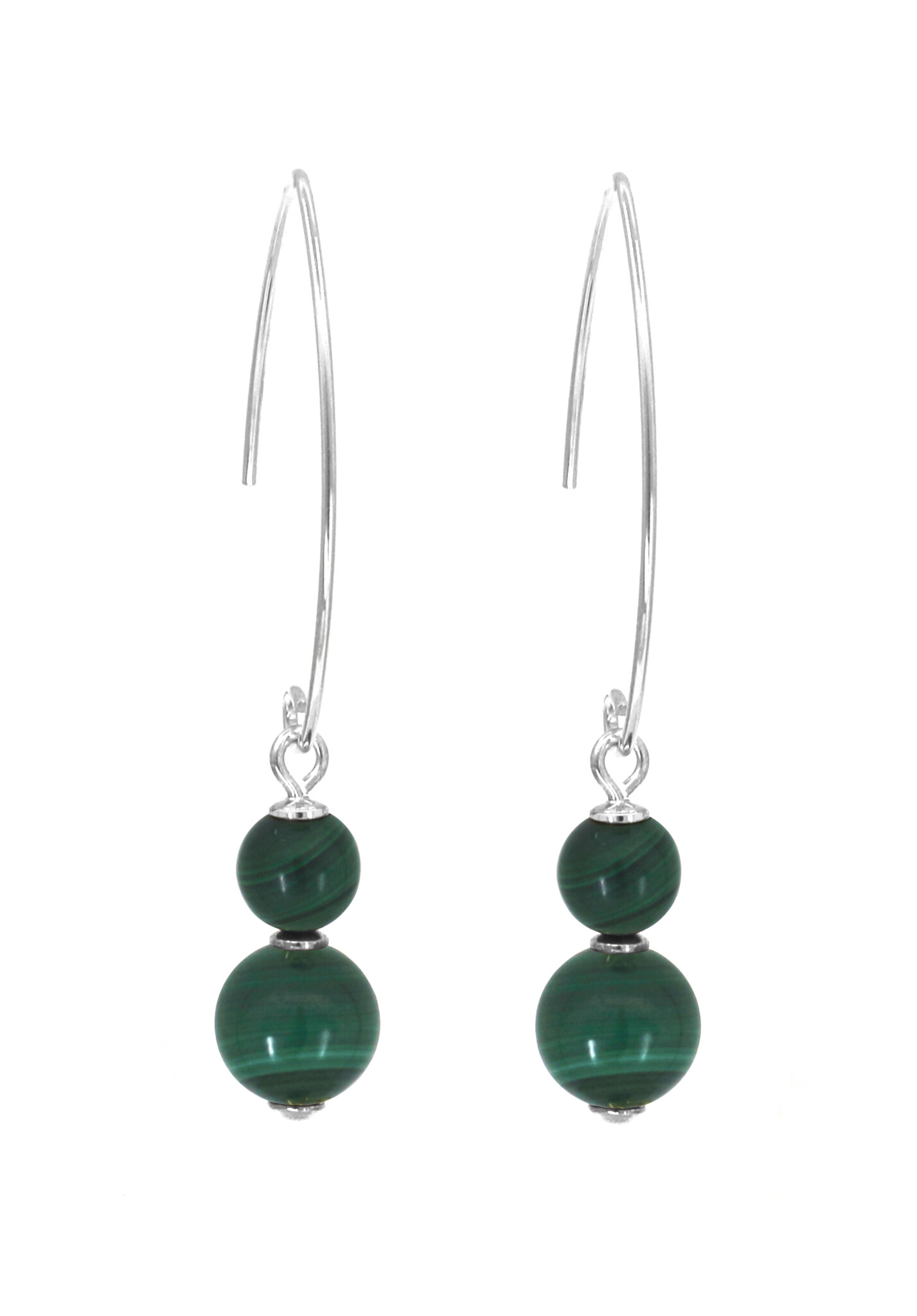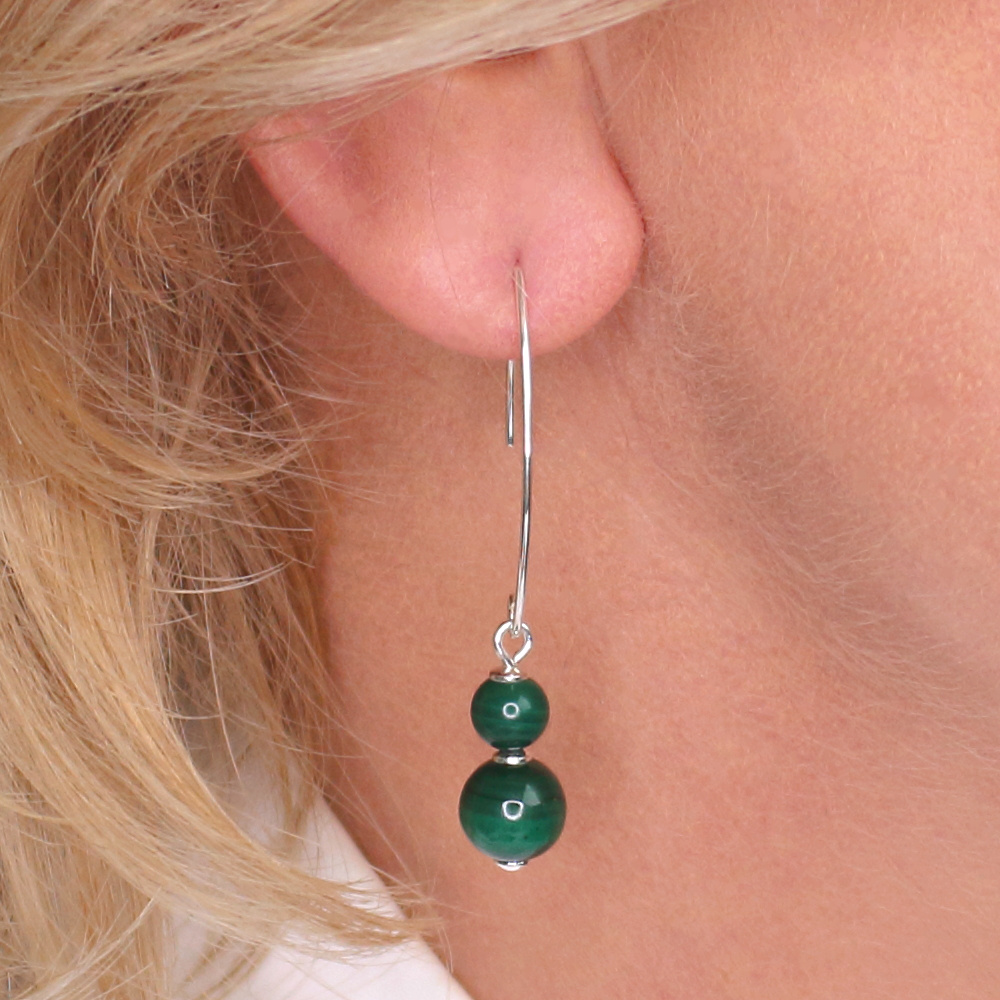 Moderne sterling zilveren oorbellen met twee malachiet kralen in verschillende maten. De oorbellen zijn handgemaakt en uniek. Deze mooie edelsteen is een stijlvolle aanvulling op je sieradencollectie.