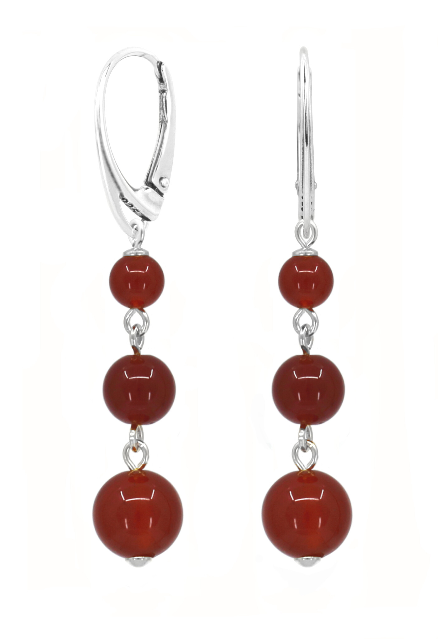 Handgemaakte sterling zilveren oorbellen met een hanger van glanzende rode carneool kralen in drie verschillende maten.