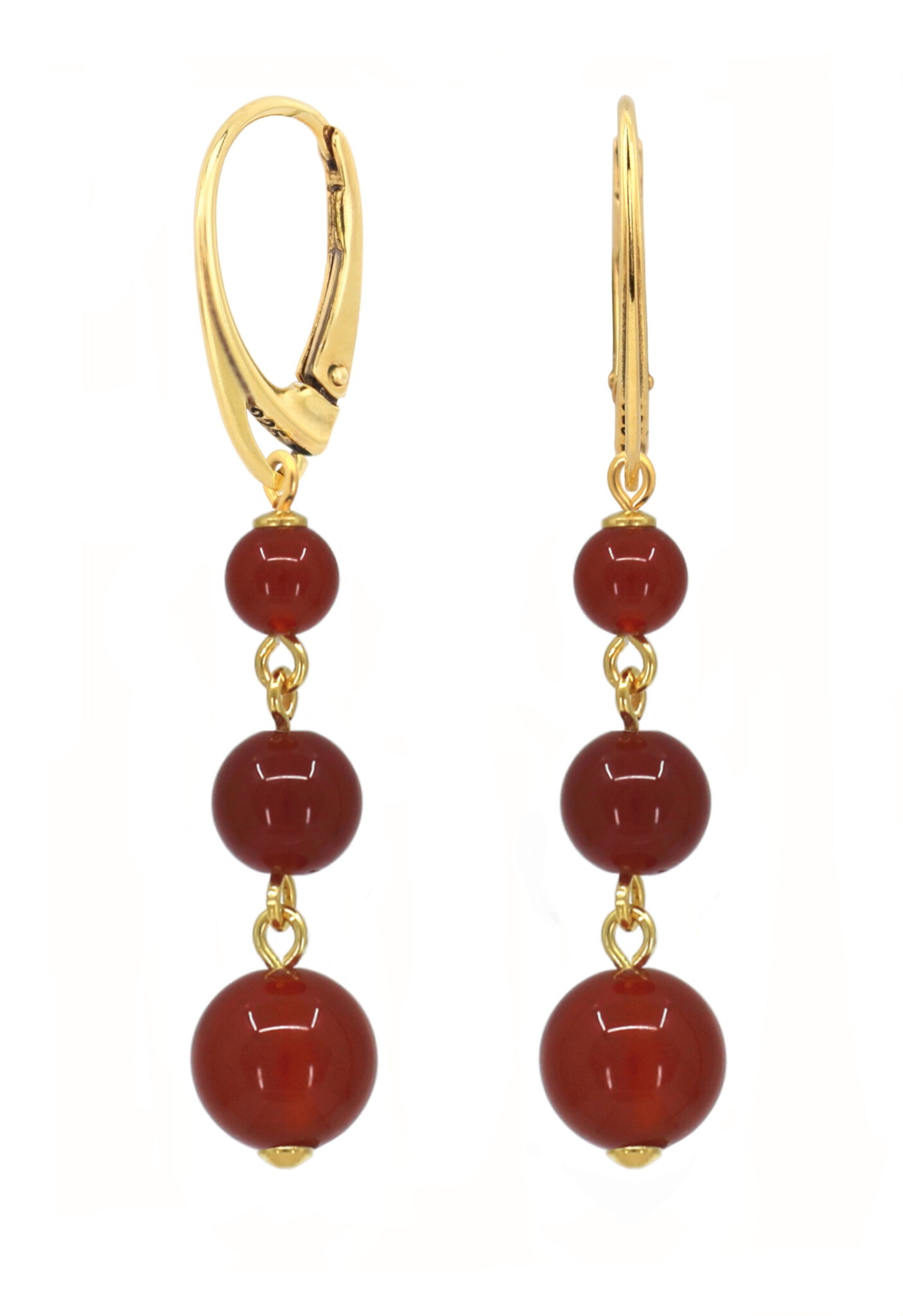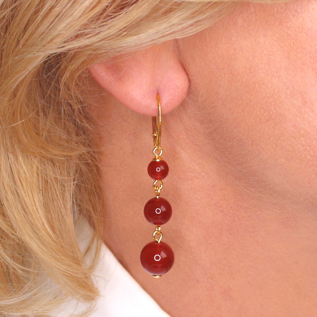 Handgemaakte oorbellen, verguld met zilveren kern, met een hanger van glanzende rode carneool kralen in drie verschillende maten.