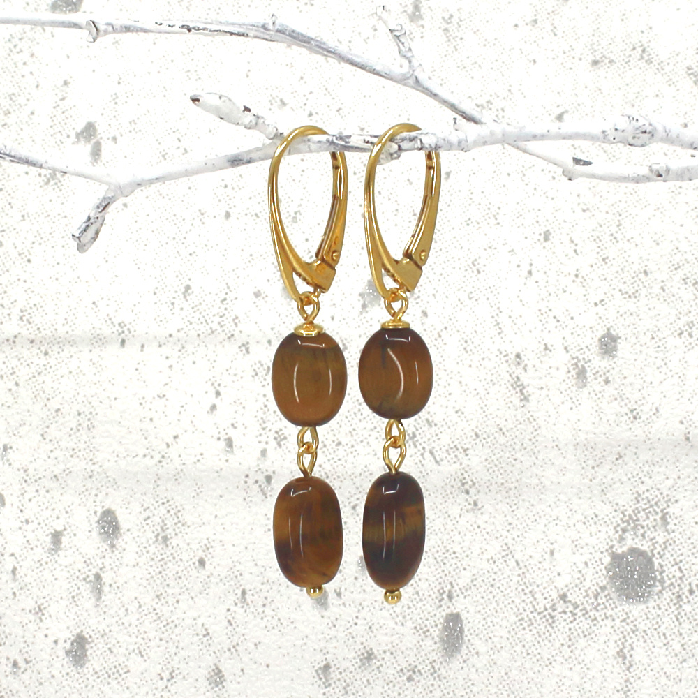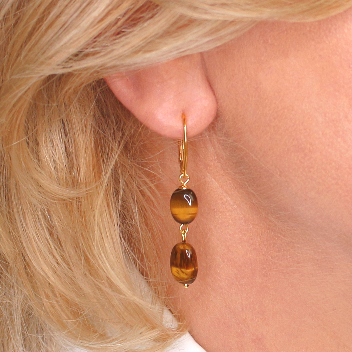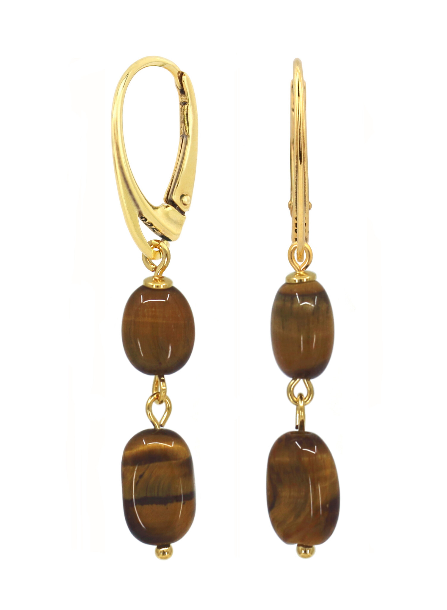 Oorbellen, verguld met zilveren kern, met een hanger gemaakt van twee prachtige glanzende ovale tijgeroog kralen. Tijgeroog is een edelsteen met een mooi kleureffect waardoor het sieraad makkelijk met modekleuren en stijlen te matchen is.