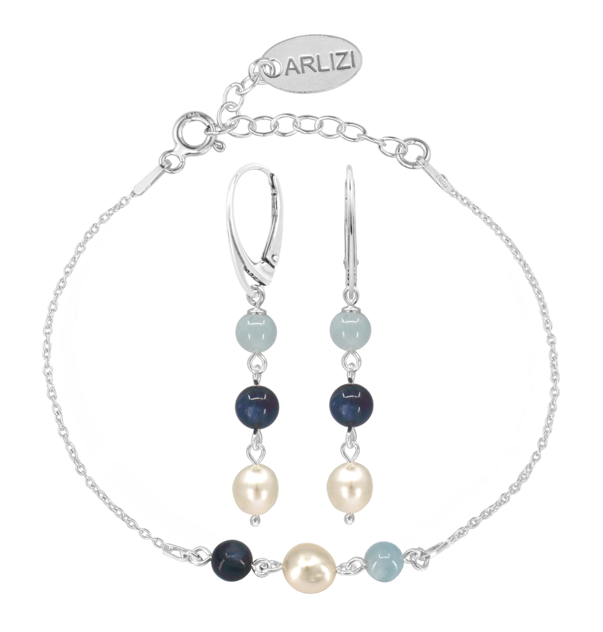 Handgemaakte sterling zilveren oorbellen en armband met een moderne look met prachtige lichtblauwe aquamarijn, blauw-grijze kyaniet en witte zoetwaterparel kralen. De edelsteentjes hebben een mooie glans en passen bij de nieuwste trendkleuren.